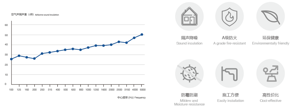 復合阻尼隔聲板IB07兩面分別采用不同厚度高密度無機材質,中間夾2mm高分子阻尼膠,高壓復合成三合一夾芯結構。兩面無機材質與中間阻尼膠形成阻尼約束,改變原材質的共振頻率,倍數提升了原材質的空氣隔聲量和結構隔聲量。