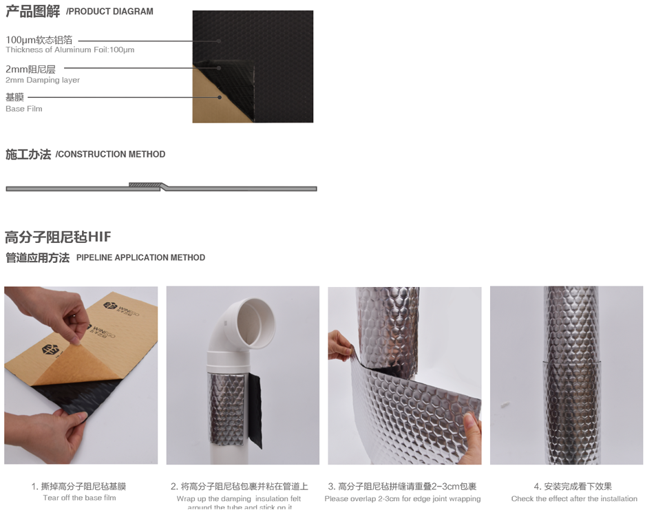 • 適用范圍1、樓板鋪墊配合使用,有效增加樓板撞擊和空氣聲 雙重隔音效果; 2、管道包裹,提升PVC管壁隔音降噪性能; 3、隔音罩、工程機械、汽車轎廂、船倉、引擎倉的 金屬阻尼止振材質隔音量提升等。