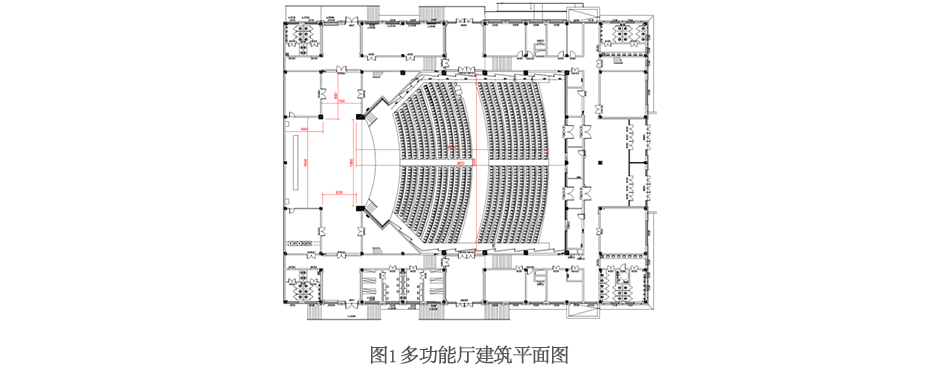 本方案以廣東省廣州市某學(xué)院的多功能廳聲學(xué)建設(shè)為例。該多功能廳主舞臺高度高達(dá)15m,一般設(shè)有數(shù)量很多的吊桿;舞臺面積較大,含主臺、側(cè)臺和后臺,整體呈品字型。