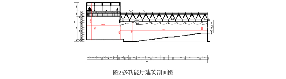 多功能廳觀眾廳平面呈鐘形,觀眾廳長37m,寬32m,最高點8.1m,最低點3.6m。舞臺面比第一排高0.8m。觀眾廳為大跨度的輕質(zhì)屋面,舞臺屋面為混凝土樓板。