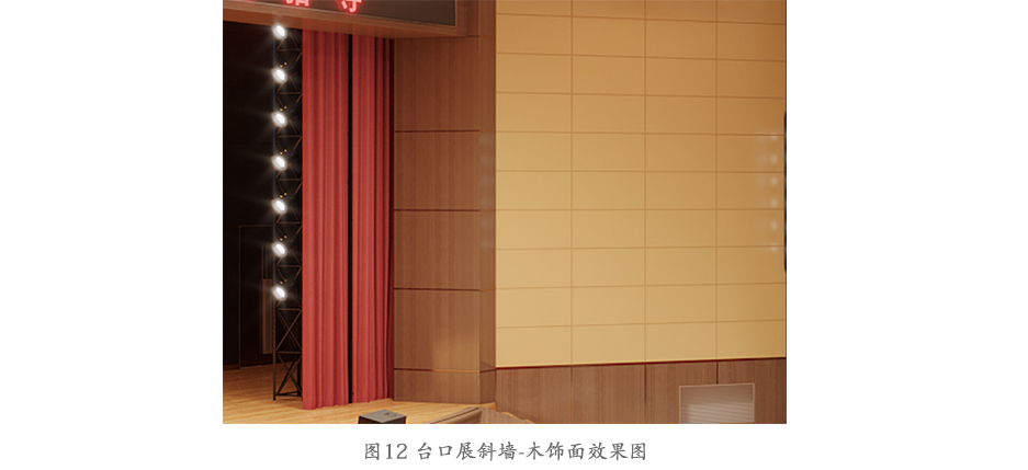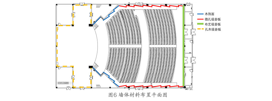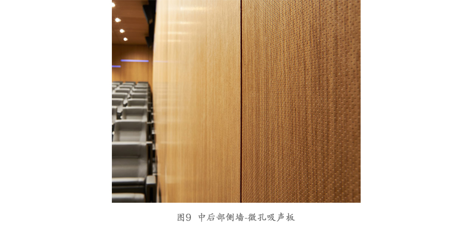 中后部側(cè)墻布置微孔吸聲板進(jìn)行吸聲處理,折線造型能提高聲擴散效果,提高聲場均勻度、語言清晰度,避免產(chǎn)生顫動回聲聲學(xué)缺陷;