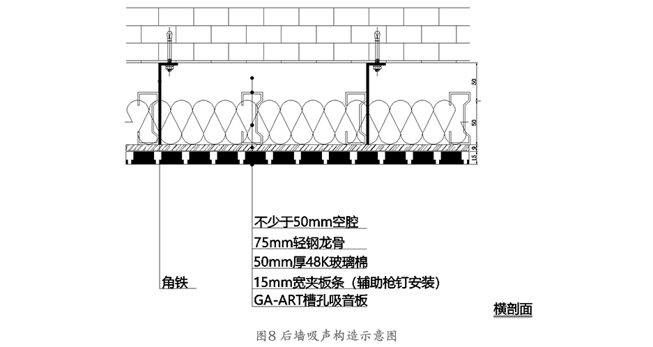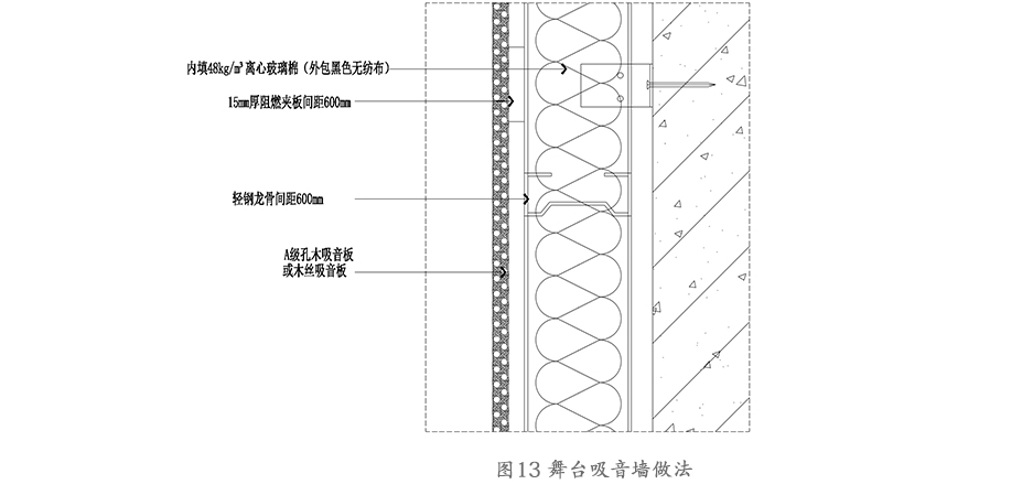 A級孔木吸音板+50 輕鋼龍骨(填 50mm 厚 48k 玻璃棉,外包玻纖布)+建筑墻體,為減少對舞臺燈光的反光,應(yīng)選用黑色,安裝位置為舞臺墻面一層天橋以下墻面,其他非吸聲墻面刷黑色乳膠漆,其構(gòu)造及安裝方式如下: