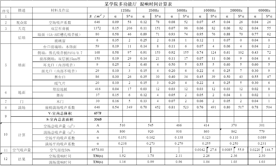 混響時間計算,通常要計算125、250、500、1000、2000和4000 Hz六個頻段的值。