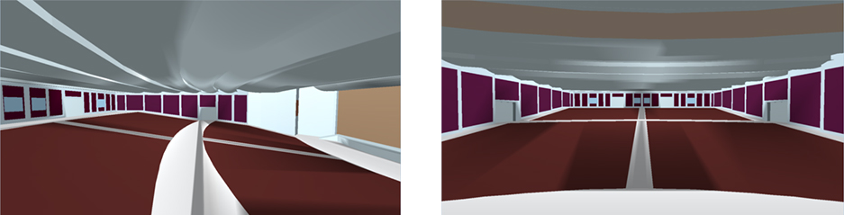 本三維模型對觀眾廳體型作了適當(dāng)簡化:根據(jù)ODEON官方建議,對門窗與墻作同一平面處理,曲面用平面擬合,在保證模擬準(zhǔn)確度的基礎(chǔ)上提高音質(zhì)計算效率。上圖為從舞臺望向觀眾廳后墻方向聲學(xué)模型渲染圖,下圖為后部觀眾席區(qū)域望向舞臺口方向聲學(xué)模型渲染圖。