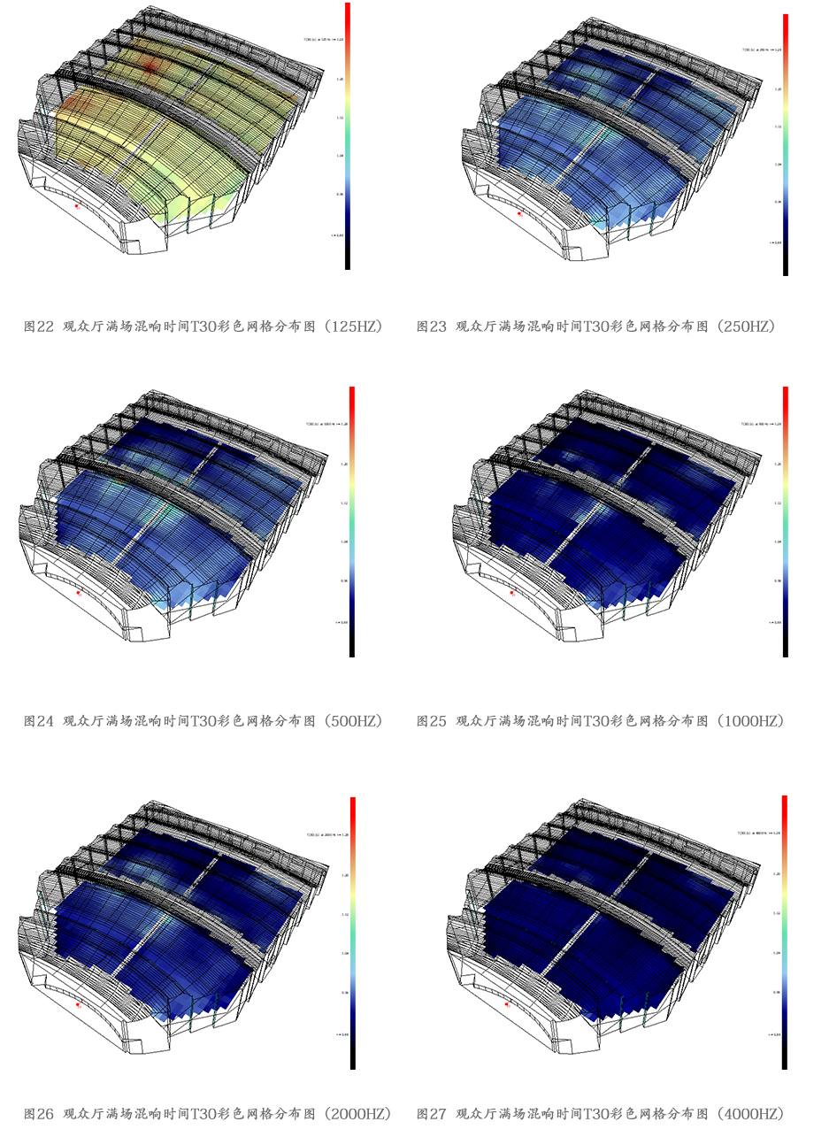 低頻混響時間相對中頻有一定的抬升,低音比BR=1.15>1,保證語音具良好的飽和度、渾厚感;高頻與中頻接近,保證語音具良好的嘹亮感;混響時間的頻率特性平直符合設(shè)計要求。據(jù)T30 彩色網(wǎng)格分布圖可以看出,混響時間分布比較均勻,最大值和最小值在合理的范圍內(nèi)。