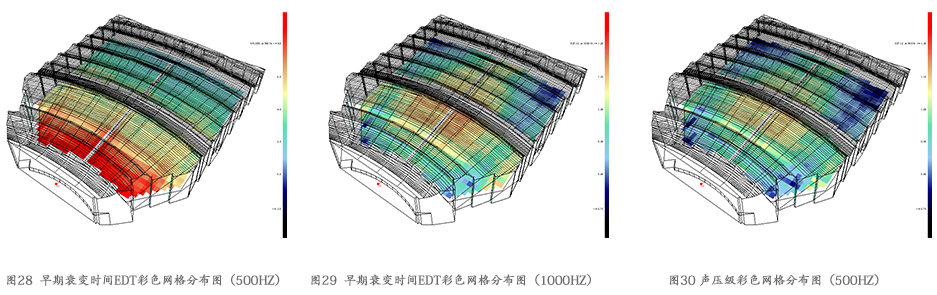 彩色網(wǎng)格法:將觀眾區(qū)聽音面劃分成0.75m x 0.75m的小方格,對每一格進(jìn)行音質(zhì)模擬計算,音質(zhì)數(shù)值以顏色表示。