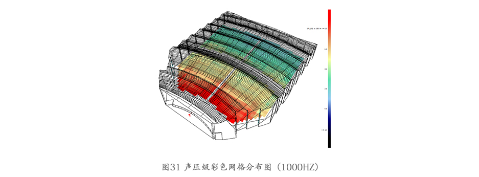 從聲壓級數(shù)值彩色網(wǎng)格分布圖可以清楚看出,觀眾廳聲壓變化均勻,不存在突變區(qū)域。