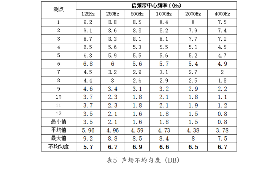 從表 5可以得出,觀眾廳內(nèi)除125Hz頻段外,各個頻段的最大和最小聲壓級差均稍稍大于6dB。原因是本案廳堂長度過大,最后一排到舞臺大幕線的距離超過34m,高于劇場一般要求的30m以內(nèi);最后排離舞臺距離較遠(yuǎn),故舞臺上的聲音傳遞到最后排后能量過小,導(dǎo)致其與前排的聲壓差稍稍大于6dB。若除去30m以外的那最后幾排,整個聲場聲壓變化均勻,均勻度較好,能滿足設(shè)計指標(biāo)要求。
