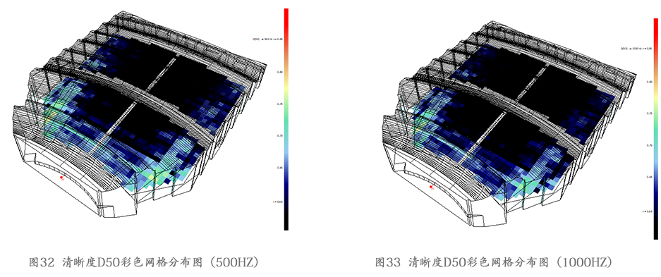 從清晰度D50值彩色網(wǎng)格分布圖可以清楚看出,僅有小部分觀眾區(qū)域(主要集中在觀眾區(qū)中部,面積約10%)D50值略低于0.5。通過合適的電聲系統(tǒng),可進(jìn)一步提高全場的語言清晰度。