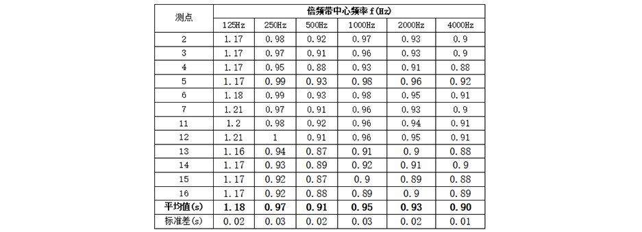 表3 12個測點混響時間平均值和標(biāo)準(zhǔn)差
