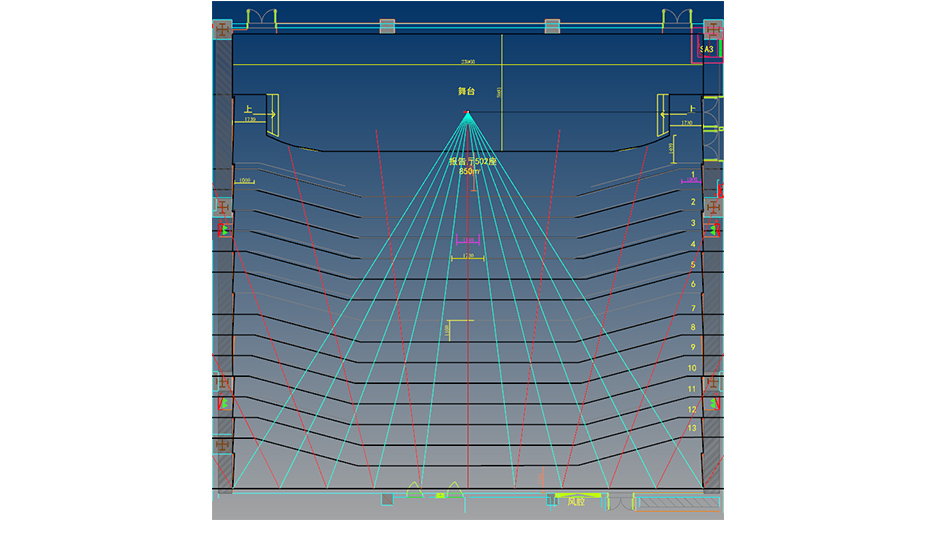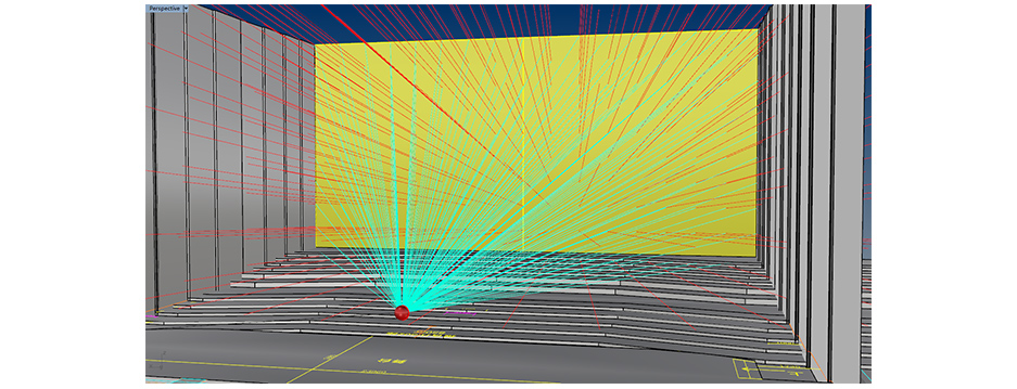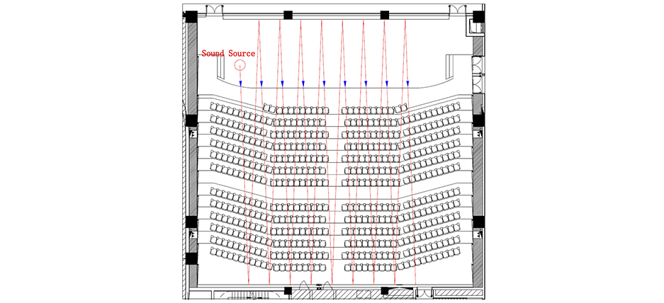 觀眾廳后墻是易產(chǎn)生回聲的界面。紅色點(diǎn)表示聲源,青色線為入射聲線,紅線為反射聲線。可清楚看到,聲音從舞臺(tái)發(fā)出后,經(jīng)后墻反射,大量的回聲返回到舞臺(tái)。