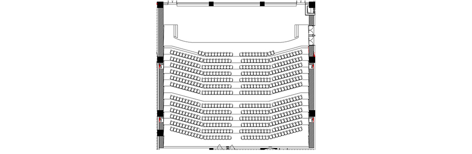 報(bào)告廳平面為矩形,整個(gè)房間呈鞋盒型。觀眾廳長(zhǎng)約23m,寬24m,高6.87m。平面呈矩形。