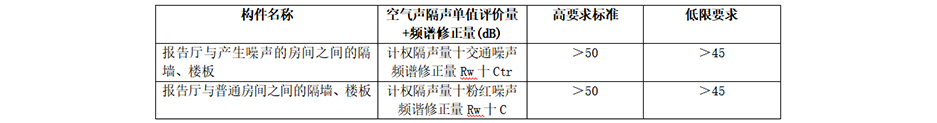 為了防止外界噪聲傳入室內(nèi)影響報(bào)告廳正常使用,故報(bào)告廳的門(mén)窗墻體樓板等建筑構(gòu)件需滿足隔聲要求。科學(xué)的隔聲設(shè)計(jì)能提高語(yǔ)言私密性,提高會(huì)議內(nèi)容的保密性;防止外界噪聲傳入報(bào)告廳,降低廳堂使用體驗(yàn)。