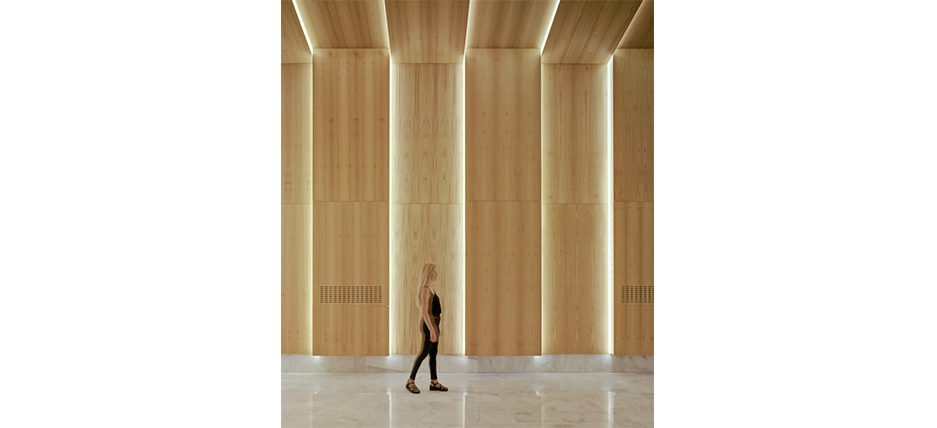 吊頂使用A級(jí)木飾面。木飾面比較密實(shí),表觀密度也比較大。木飾面之所以吸聲系數(shù)較高一點(diǎn),主要還是靠木飾面的共振吸聲。木飾面的共振頻率一般是 100—300Hz,飾面板后留有空腔(空氣層),可以改善低頻的吸收性能,而且空腔深度越大,共振吸聲峰值越向低頻移動(dòng)。木飾面的吸聲峰值處的頻率,基本都集中在低頻,都是在木飾面吸聲結(jié)構(gòu)的共振頻率處。