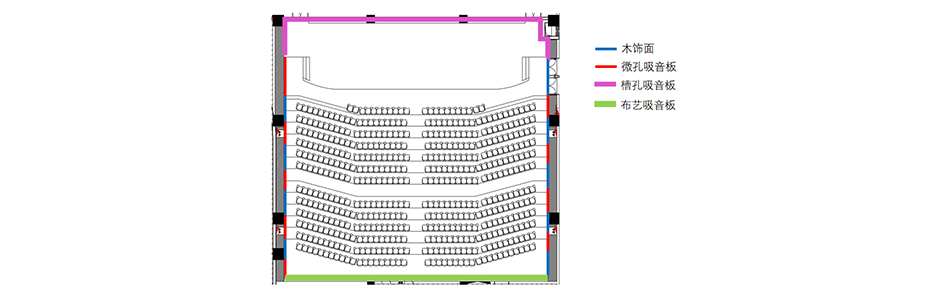 報(bào)告廳兩兩相對(duì)的側(cè)墻互為平行面,需至少對(duì)其中一面墻體作強(qiáng)吸聲處理,以防止產(chǎn)生顫動(dòng)回聲聲學(xué)缺陷。本案報(bào)告廳吸音墻平面布局圖如下: